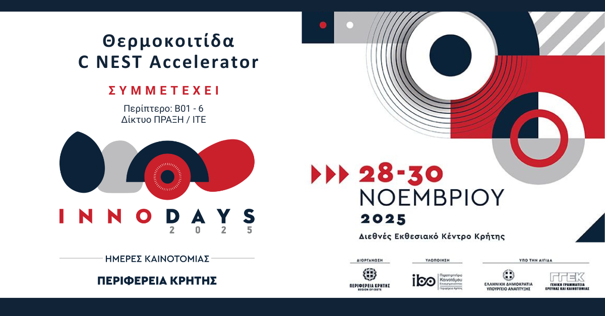Η Θερμοκοιτίδα Επιχειρηματικότητας Κρήτης – C Nest Accelerator συμμετέχει στις InnoDays – Ημέρες Καινοτομίας Περιφέρειας Κρήτης 2025 (28–30 Νοεμβρίου 2025, Διεθνές Εκθεσιακό Κέντρο Κρήτης), προβάλλοντας τον ρόλο της στην υποστήριξη της νεοφυούς και καινοτόμου επιχειρηματικότητας στην Κρήτη.